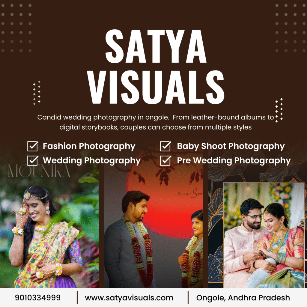 Professional photographers in Ongole also serve nearby towns and districts. Couples from Kandukur, Addanki, Markapur, Bapatla, Guntur, Nellore, and other areas often book services to ensure their wedding and pre-wedding shoots are captured with expert creativity. By combining destination wedding photography Ongole techniques with local knowledge, photographers can select the best locations, lighting, and poses for unique and memorable images.